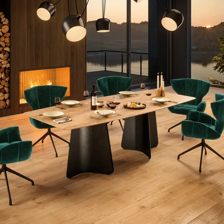 Sculptural dining table with a steel base and a solid-wood tabletop that appears delicate, featuring a Swiss edge