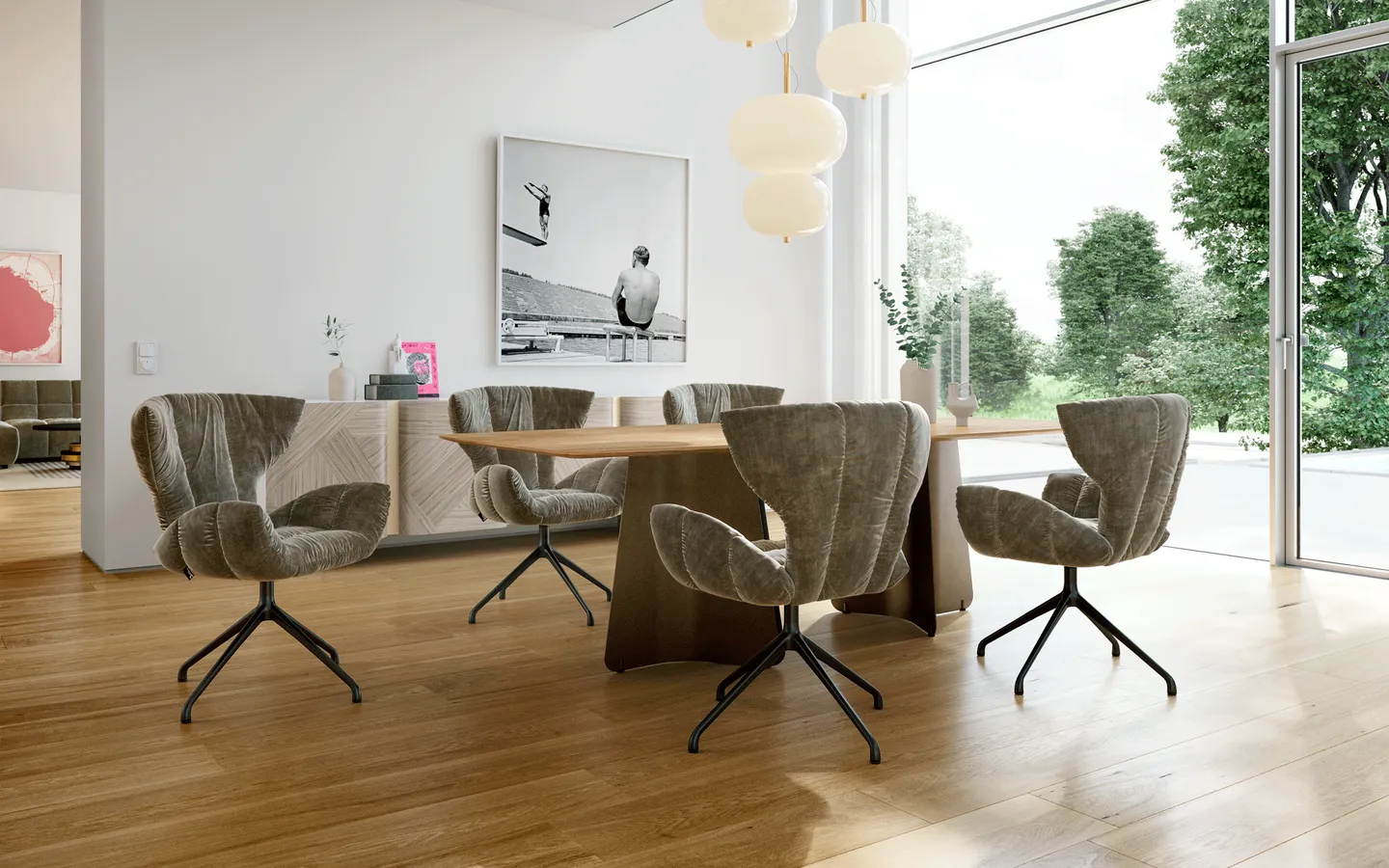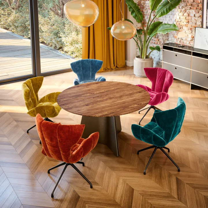 Table de salle à manger sculpturale avec base en acier et plateau en bois massif à l’aspect délicat, avec bord « arête suisse »