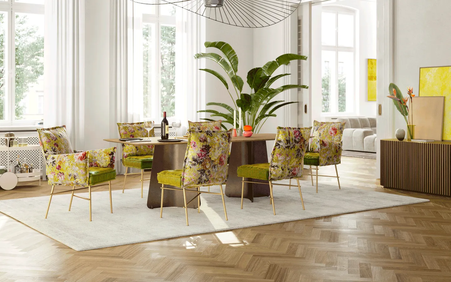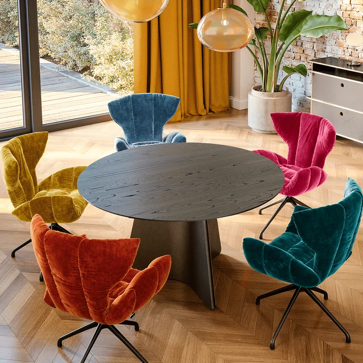 Table de salle à manger sculpturale avec base en acier et plateau en bois massif à l’aspect délicat, avec bord « arête suisse »