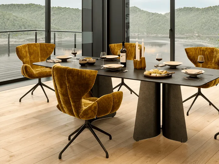 Skulpturaler Esstisch mit Stahlgestell und filigran anmutender Vollholztischplatte mit Schweizer Kante