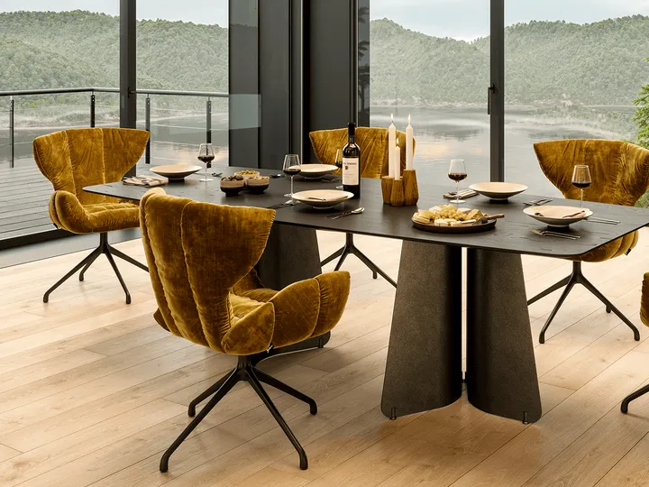 Skulpturaler Esstisch mit Stahlgestell und filigran anmutender Vollholztischplatte mit Schweizer Kante