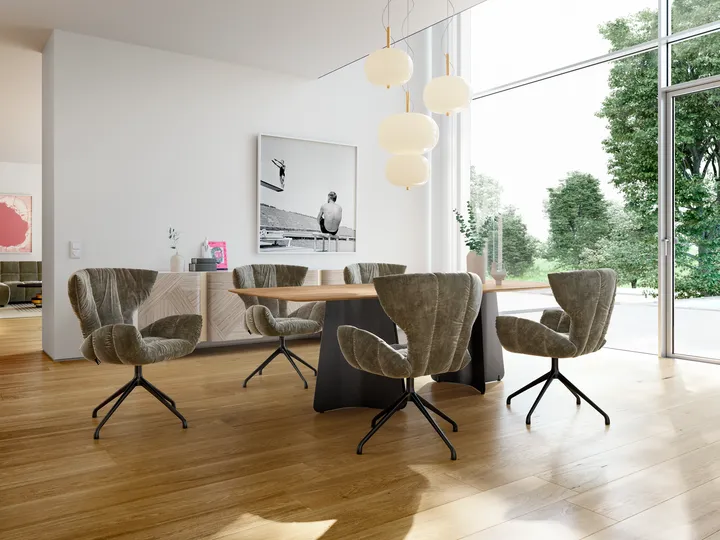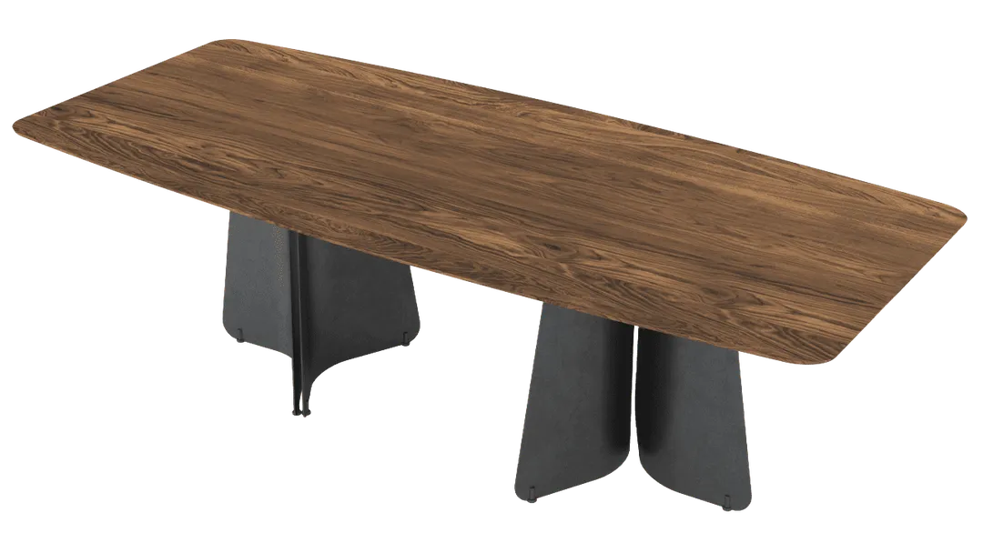 Skulpturaler Esstisch mit Stahlgestell und filigran anmutender Vollholztischplatte mit Schweizer Kante